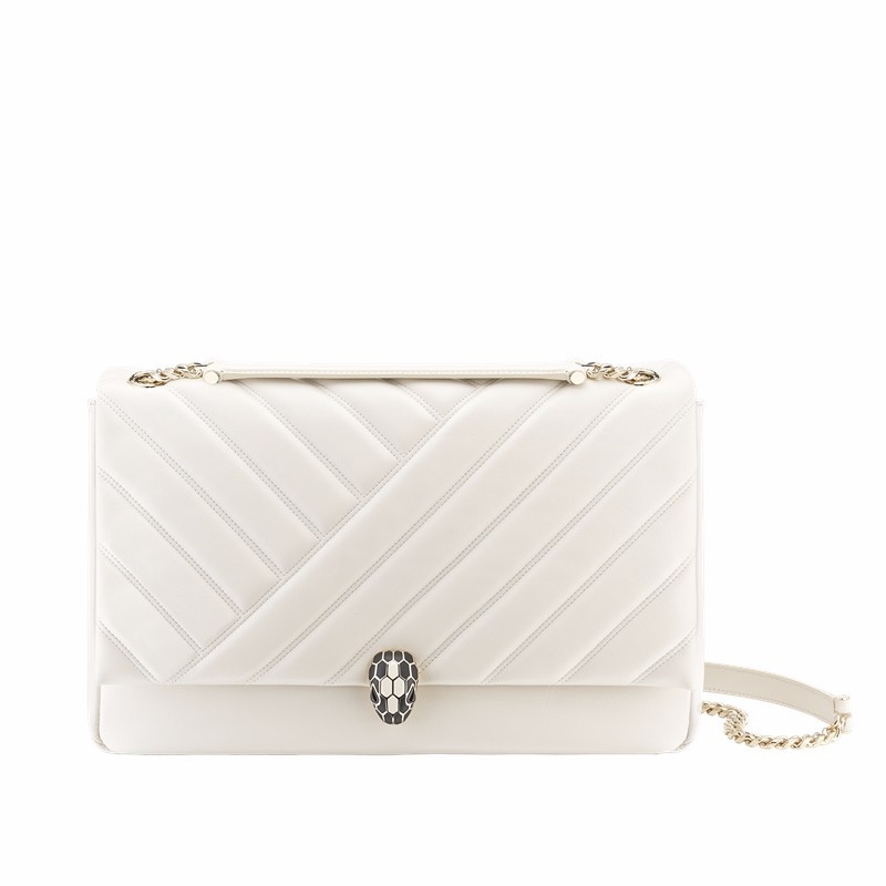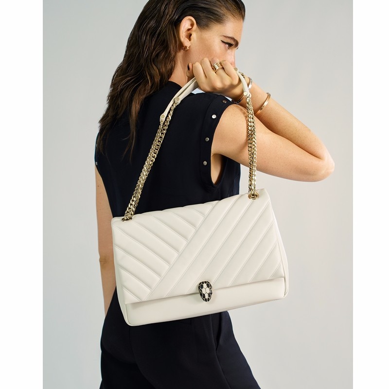 全新的Serpenti Cabochon单肩包准备以实用和精致的设计进入Serpenti系列,具有独特的contrast缝图案和独特的缝图案和醒目的金属细节。几何och缝图案的灵感来自凸圆形切割宝石的起伏表面,为这款白色玛瑙小牛皮手袋的身材增添了更多柔软感。签名扣Serpenti白金镀金黄铜和玛瑙白色珐琅,elegant玛瑙双眼。这款包包饰有厚实的链条和两条舒适的皮革肩带,是打造精致日装外观的配件,以增加多功能性。大号款式,带有风箱隔层,内部带拉链的口袋和开放式口袋。内侧带有宝格丽徽标的金属板。尺寸:34 x 24 x 12厘米。