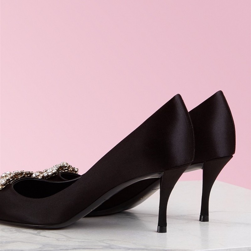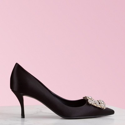 本款Flower Strass单鞋精选真丝缎制成,搭配水钻镶嵌饰扣,是搭配晚装的单品。
