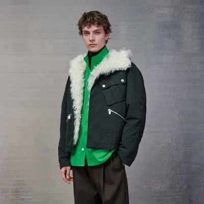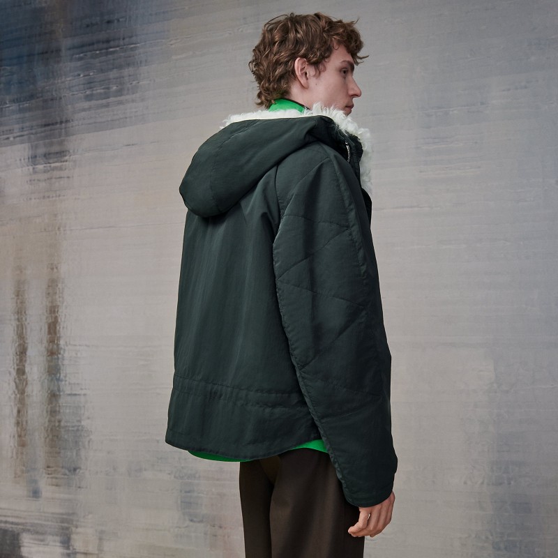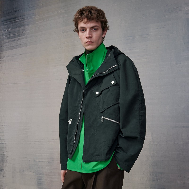Details of the look: the model is also wearing a boxy fit overshirt (product reference H266500H238), a "Profil H 2.0" turtleneck sweater (product reference H267005HA38) and a Sevres pants with pleats (product reference H265320H738)