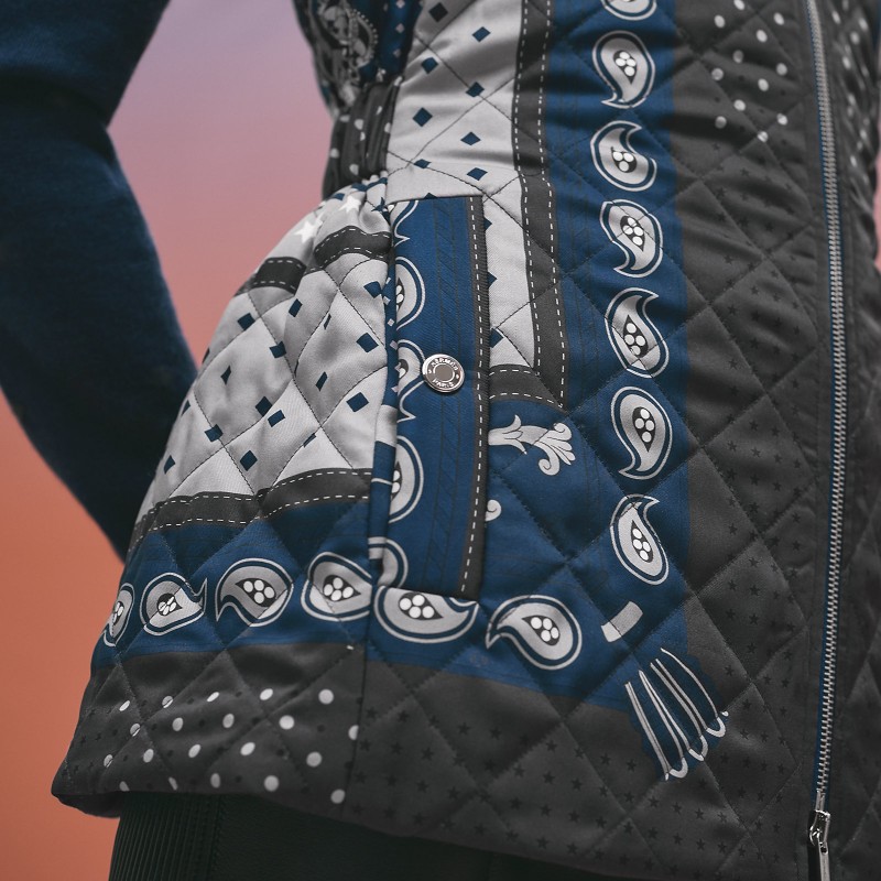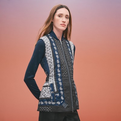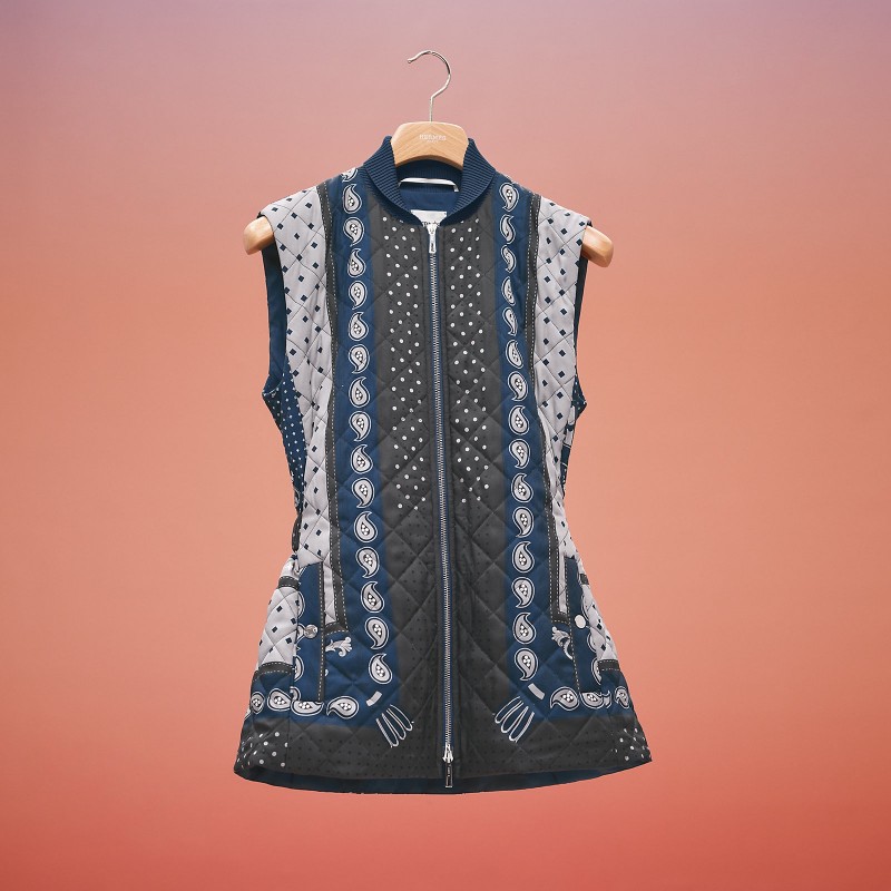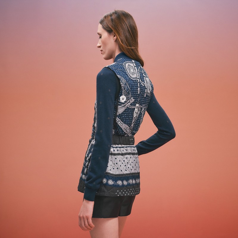 Sleeveless quilted jacket in "Harnais de Cour Bandana" printed silk (100% silk)