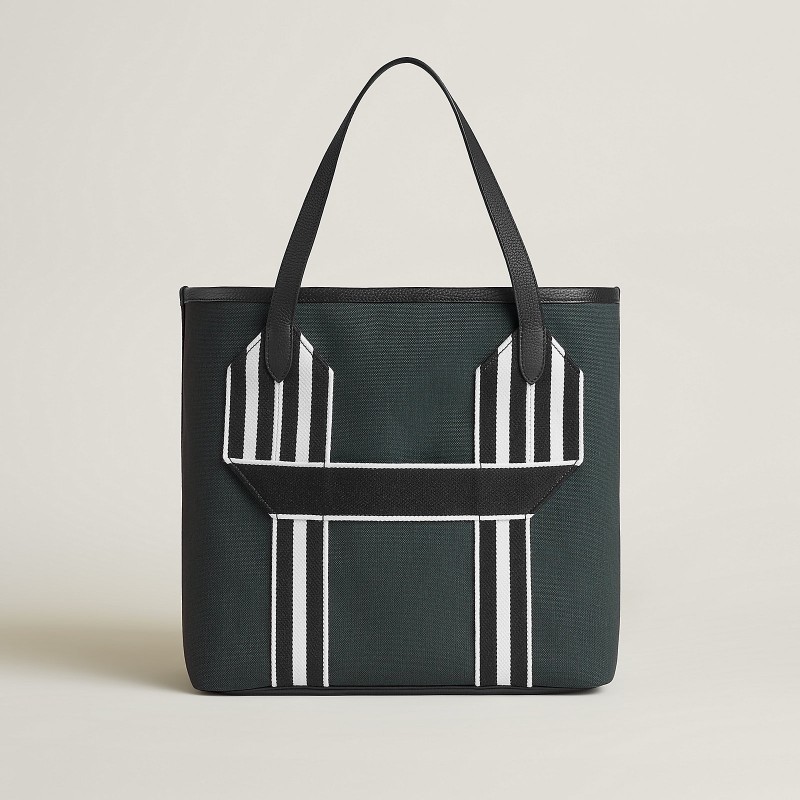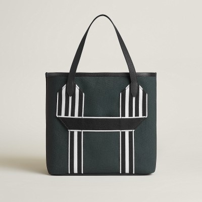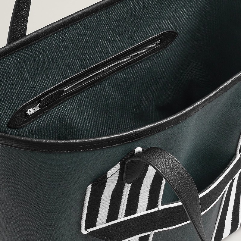 Tote bag in military canvas, taurillon Clemence leather and Wooly canvas with handles, large compartment, zipped interior back pocket and two exterior pockets
