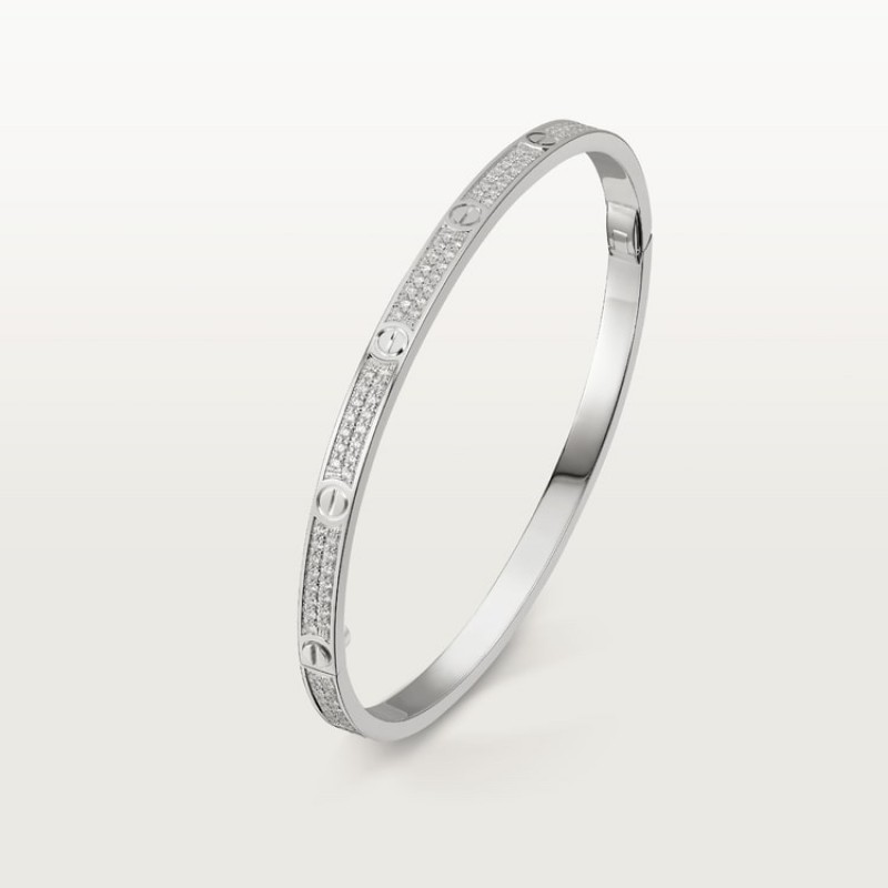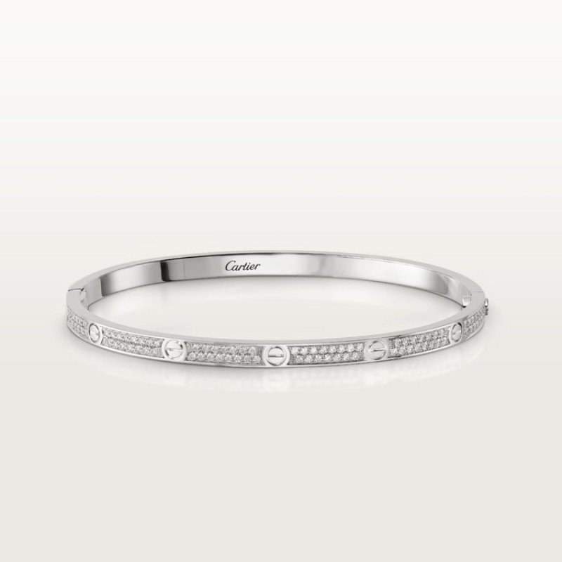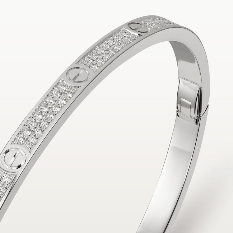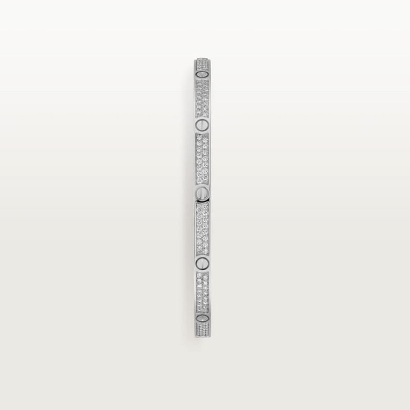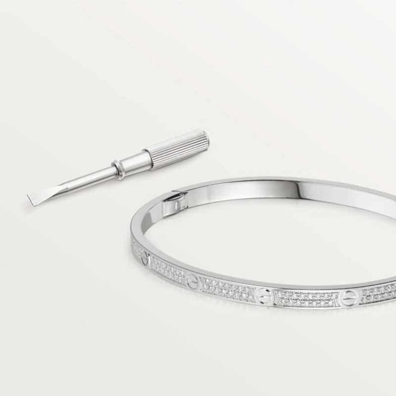 LOVE bracelet, small model, 18K white gold (750/1000), set with 177 brilliant-cut diamonds totaling 0.95 carats. Sold with a screwdriver. Width: 3.65 mm (for size 17). The iconic LOVE bracelet has been a symbol of free-spirited LOVE since 1969. Its screw motif and famous locking technology are truly timeless design signatures, while its oval shape ensures a close but comfortable fit to the wearer’s wrist. The locking mechanism consists of a single functional screw on one side of the bracelet and a hinge on the other. Each LOVE bracelet is sold with a matching screwdriver specifically created for this piece. To discover your recommended LOVEbracelet size, please visit our Bracelet Sizing Chart. Add one centimeter to your size for a tight fit, or two centimeters for a looser fit.