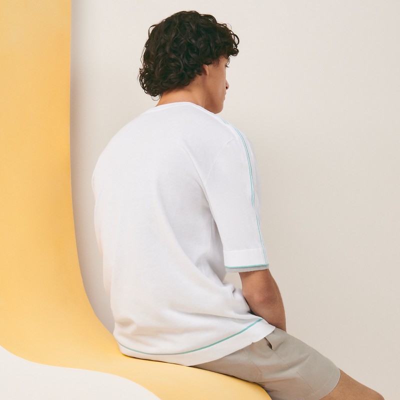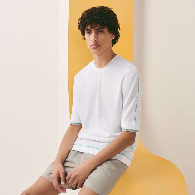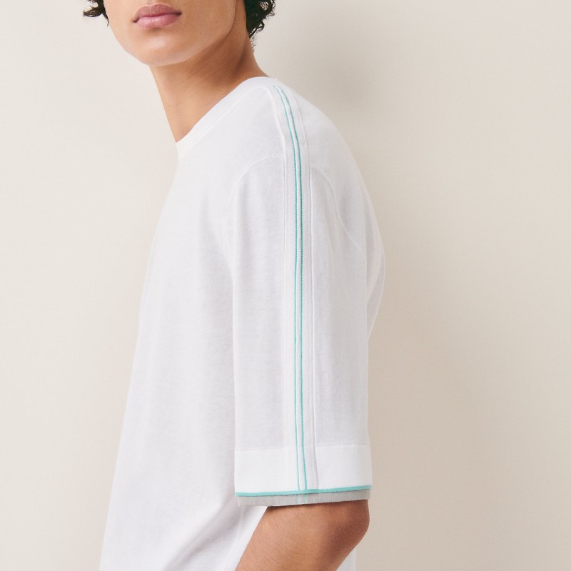 Short-sleeve crewneck t-shirt in cotton with "Double cotes H" detail (100% cotton)- Cuffs and bottom with contrasting intarsia stripes- One gauge 18 threadMade in ItalyThis piece runs true-to-size.