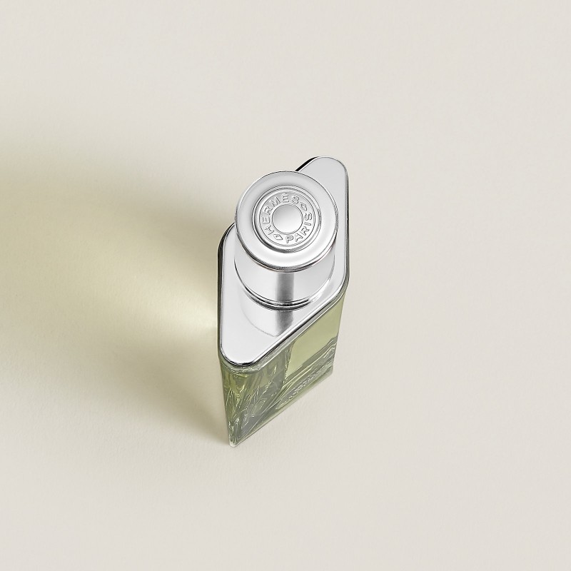 With its pure lines, the bottle designed by Philippe Mouquet is adorned with moss-green lacquer to echo the fragrance's olfactory notes. The intense grey box is decorated with a fine lime-green line that delimits and opens up the space.