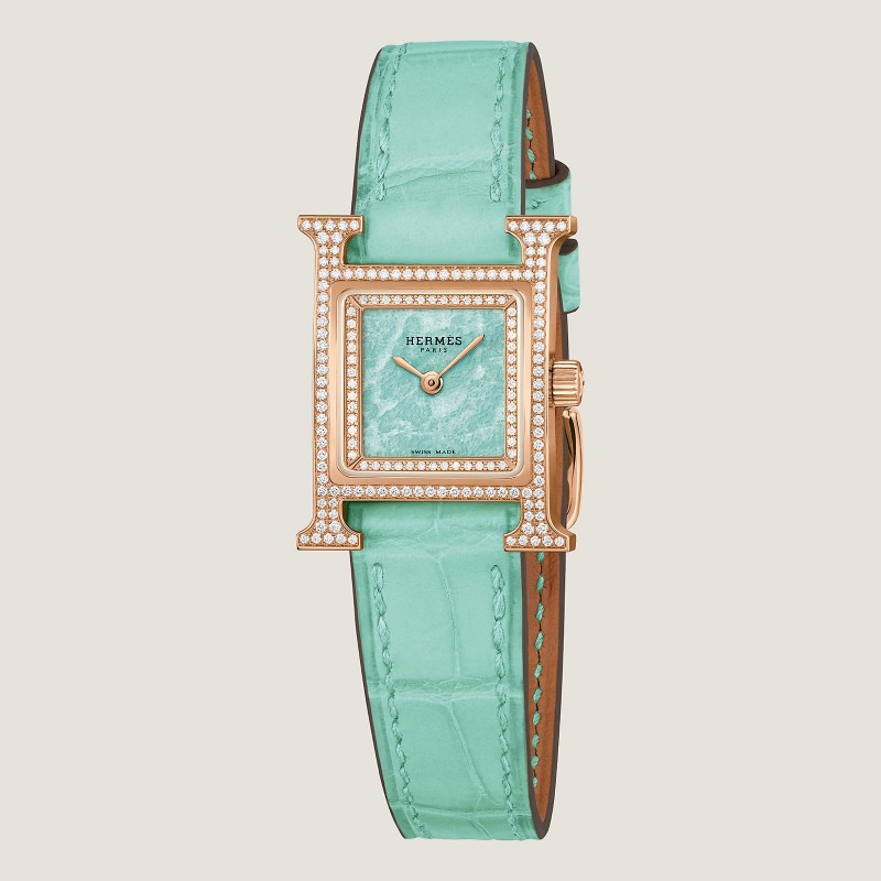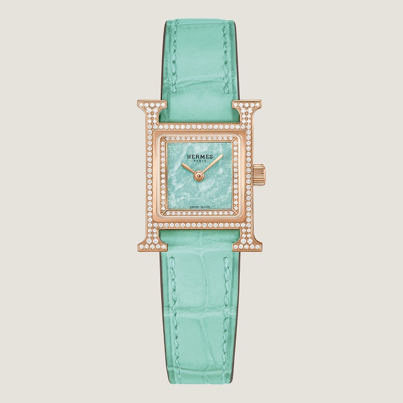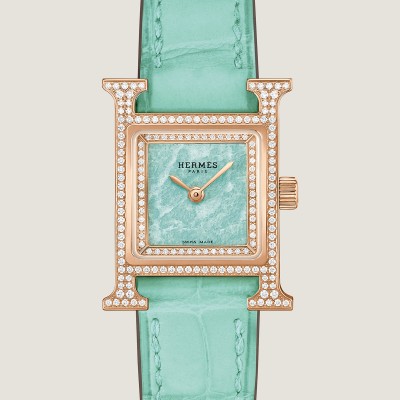 Mini model, 21 mm Lug to lug height: 21 mm Case width: 17 mm Diamond-set rose gold case, 116 diamonds (0.255 ct) Anti-glare sapphire crystal Diamond-set amazonite dial, 52 diamonds (0.072 ct) Quartz movement, Swiss Made Hour, minute functions Water-resistant to 3 bar. Avoid all contact with water while wearing your Hermès leather watch. Long single tour strap in matte aqua alligator, rose gold pin buckle