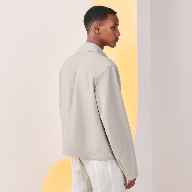 Zipped straight cut jacket in natural twill crepe with "Icones au Carre" detail (54% viscose and 46% cotton)